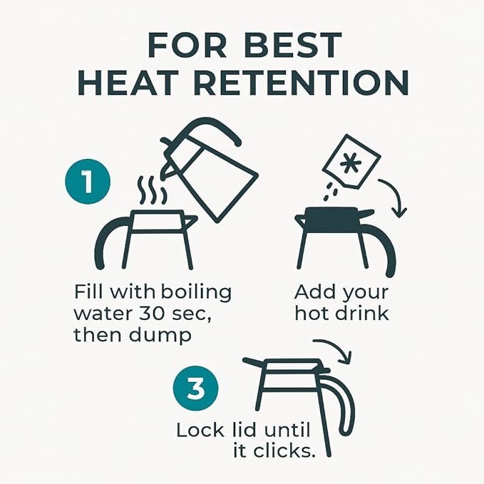 - LARGE CAPACITY HOT LIQUID CARAFE - Our 2 Liter insulated carafe pours more than 8 cups—ideal for cocoa bars, cafés, tailgates, and meetings. TIP: For up-to-12-hour heat retention, pre-heat with hot water for 30 sec, discard, add your drink, then lock the lid until it clicks.