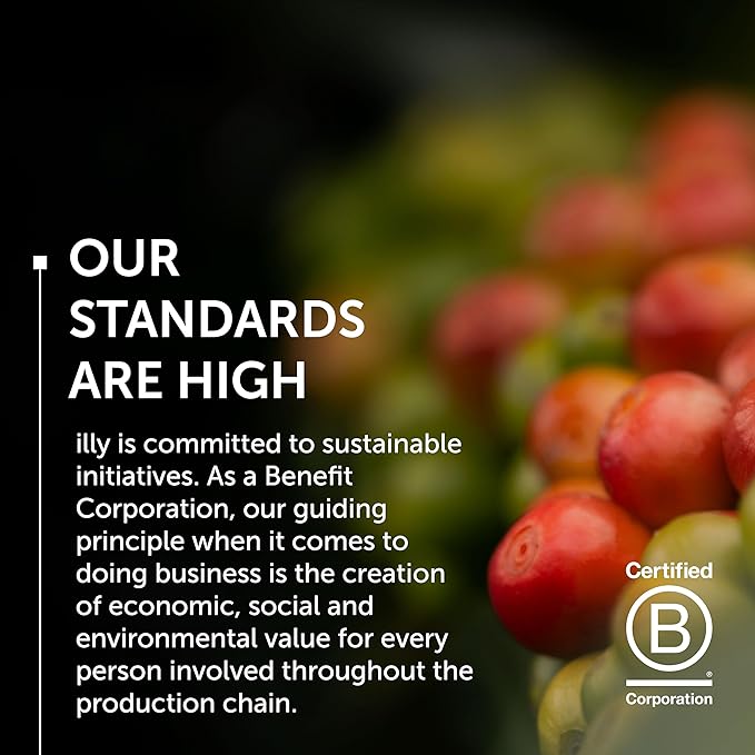 - Certified B Corp: illy is committed to sustainable initiatives, as the first Italian coffee company awarded a B Corp Certification, we strive to create positive economic, social, and environmental value for everyone involved in the production chain.