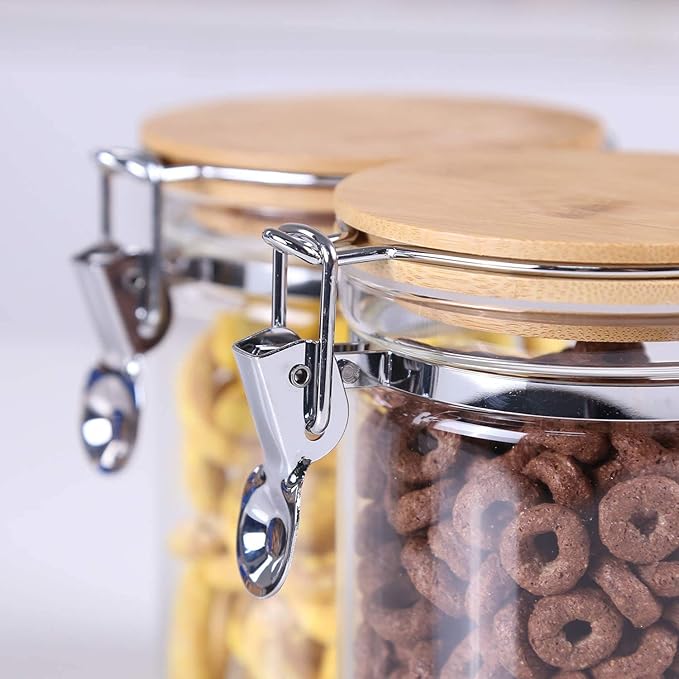 - Glass Jars with Locking Clamp Lids:The clamp lid is easy to open and lock, the hinge clip can tightly clamp the lid and keep the dry goods inside fresh and moisture-proof.