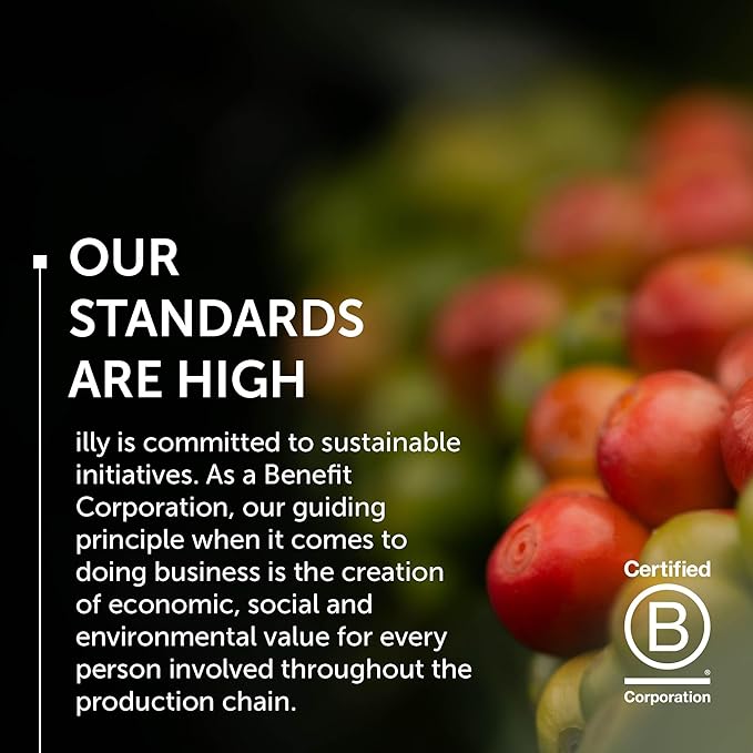 - Certified B Corp: illy is committed to sustainable initiatives, as the first Italian coffee company awarded a B Corp Certification, we strive to create positive economic, social, and environmental value for everyone involved in the production chain.