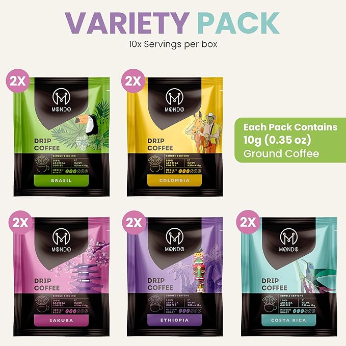 Mondo Drip Coffee Mix (10-Pack Variety), Single Serve Pour Over Filter Bags, Pre-Filled 100% Arabica, Medium Roast