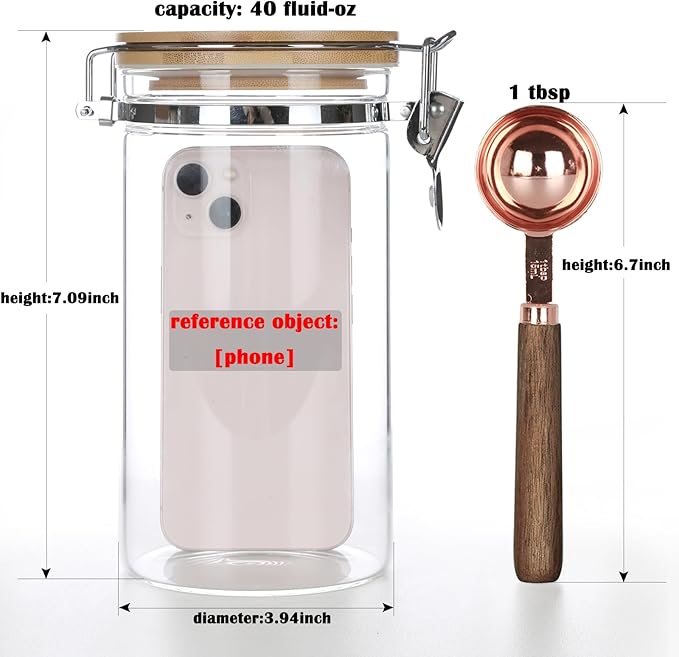 - Complete Set Includes:1 glass sealed jars (Height 7" x Diameter 3.9",Capacity:40floz/1200ml),1 wooden handle coffee scoop(1 TBSP) and label stickers.