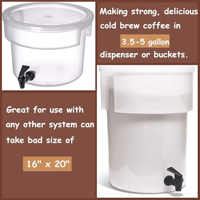 - COMMERCIAL SIZE FILTER BAGS - (100 count) Each brewing bag at 16" Wide x 20" Tall, stronger enough it can holds up to 14 lbs of wet ground coffee for making strong, delicious cold press in 3.5- 5 gallon ( or larger) dispenser and buckets as well as commercial cold brew systems. (Tips: We recommend buckets with spigot and use coarse ground coffee.) Brew a batch and keep it in the fridge for any commercial settings, such as: events, wedding, birthday party, cafes and coffee shops.