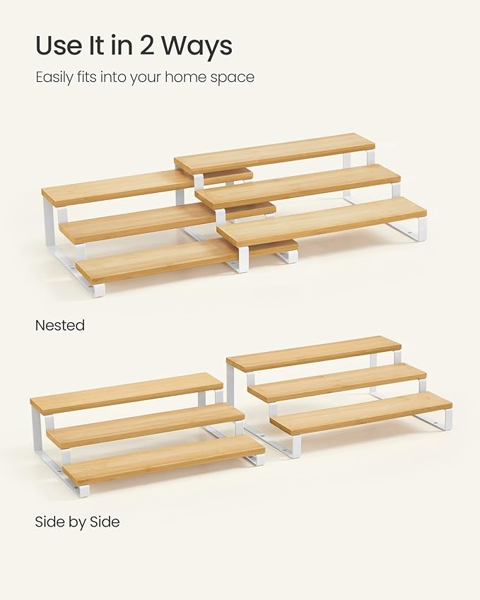 SONGMICS Display Risers, Set of 2 Engineered Wood Perfume Organizer Stand, 3-Tier Cupcake Stand Holder, Spice Rack, Shelf Risers for Figures, Dessert Shelves, Natural Beige and Cloud White UKCS016N02
