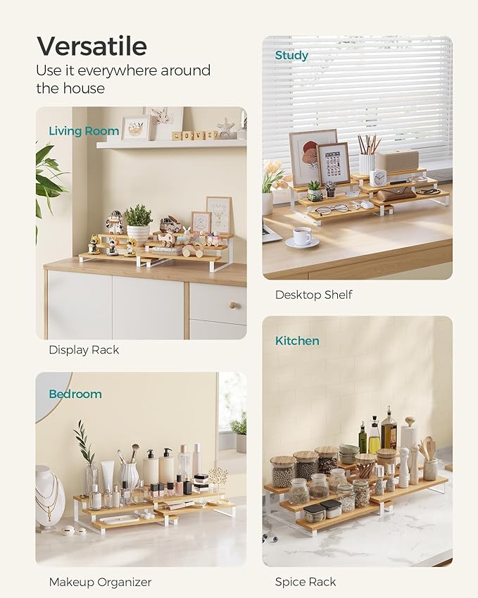 - 【FIND AT A GLANCE】With its specially designed tiered structure and each tier being 3" deep, this display riser ensures all your spice jars and items are clearly visible and easily accessible, preventing messes and keeping your kitchen organized