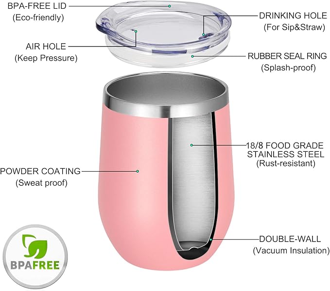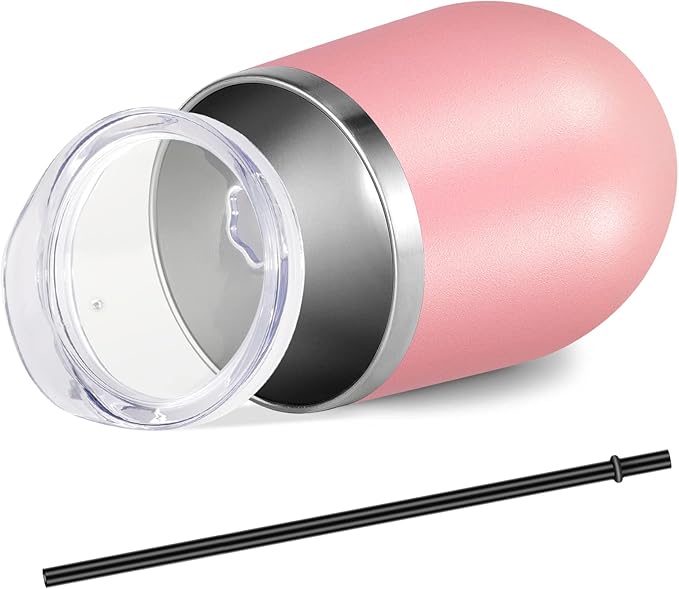 - Fashionable and Reusable: The 12oz wine tumbler bulk are made of 18/8 food grade stainless steel with non-slip frosted coating,no metallic taste. It has an eye-catching and fashionable appearance and is more solid and safer than other ordinary glasses. It is equipped with a BPA-free lid And the reusable plastic straw can be selectively used for more drinks