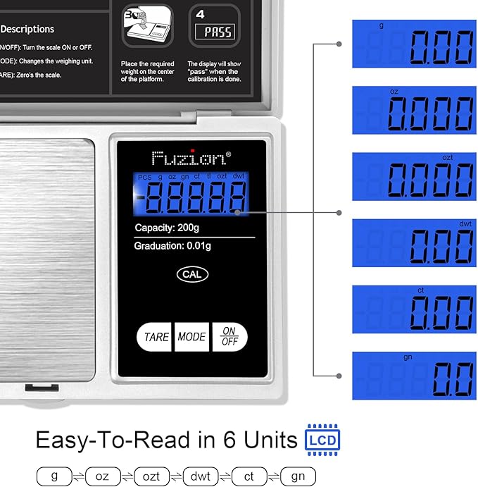 - Supper Accurate: This pocket scale has 200 gram max weight capacity and reads weights in increments of 0.01g. High precision sensors make sure the accuracy. 6 weigh modes available - g/ oz/ gn/ ct/ dwt/ ozt.