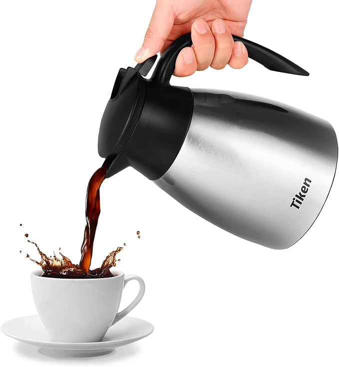 Tiken 34 Oz Thermal Coffee Carafe, Stainless Steel Insulated Vacuum Coffee Carafes For Keeping Hot, 1 Liter Beverage Dispenser (Silver)