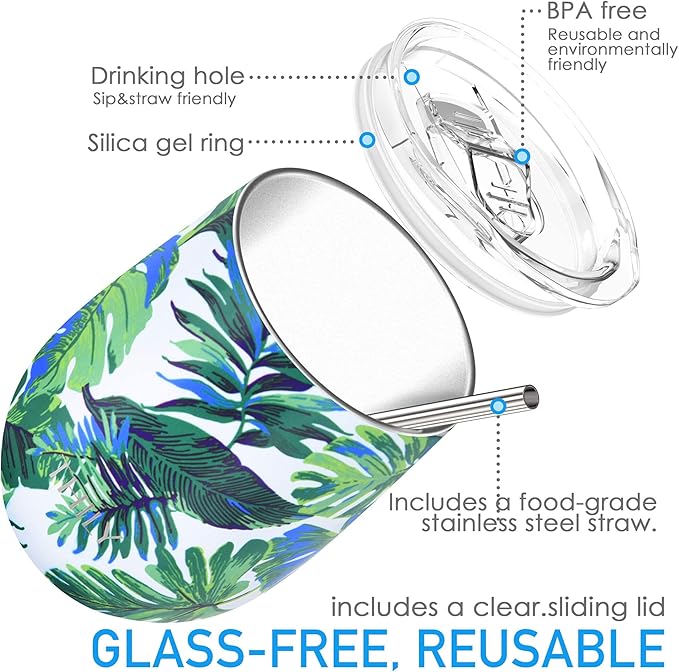 - SPLASH-PROOF LID AND RUBBER BOTTOM - comes with a push-on lid keep any dust particles getting in and stop major spills, silicone base to keep it from sliding on slippery surfaces and reduce the noise. You will also get a reusable stainless steel metal straw. Our wine tumbler set will take you to enjoy a fresh juice or an ice-cold cocktail to a new level in this summer