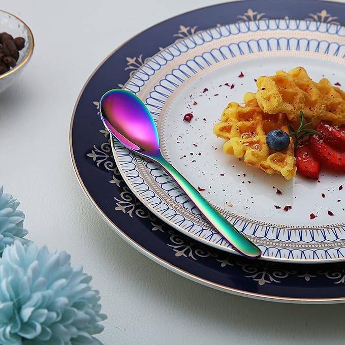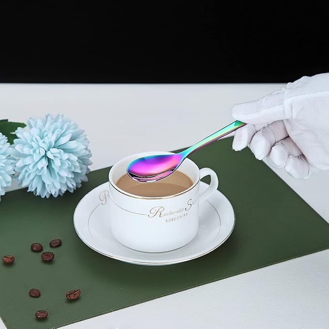 - 【Luxury and High Quality Finish】: These rainbow Small Spoons are polish with mirror finish and plating with titanium rainbow. Looks luxury and beautiful. The rainbow titanium plating would protect the surface of silverware from scrath. Food grade material healthy for daily use.
