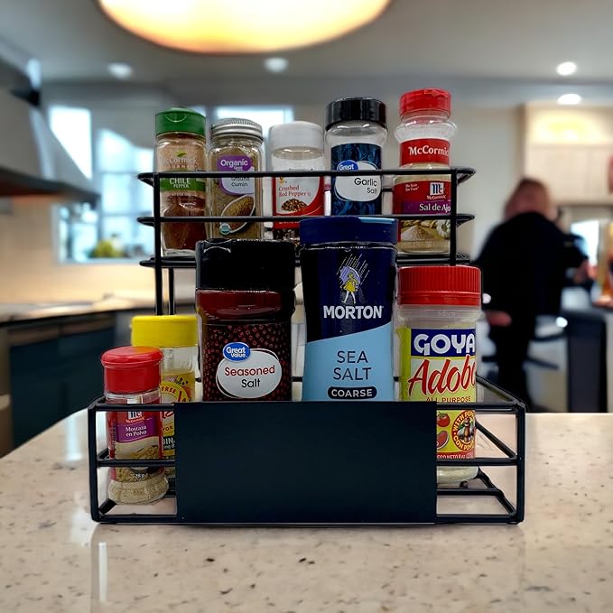 - Premium kitchen space organizer, nobody likes a cluttered kitchen, store whatever you need for those special recipes, find stuff easier in your pantry just by looking at your multi-functional wire rack, its open, two tier novelty design allows you to easily differentiate between cooking spices, olive oil bottles, flavored vinegar bottles, salad dressings, seasonings, condiment containers, coffee mugs and more! Fancy dressing compartment easy to accommodate around the kitchen to optimize space