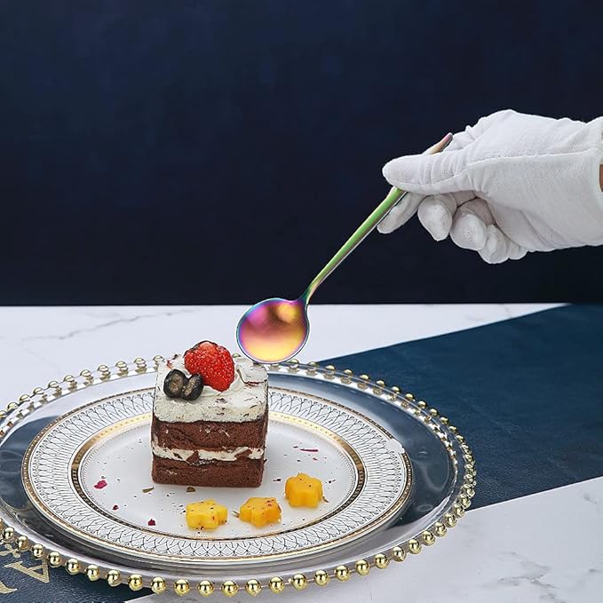 - 【Luxury and High Quality Finish】: These matt rainbow teaspoons are polish with mirror finish and plating with titanium rainbow. Looks luxury and beautiful. The rainbow titanium plating would protect the surface of silverware from scrath. Food grade material healthy for daily use.