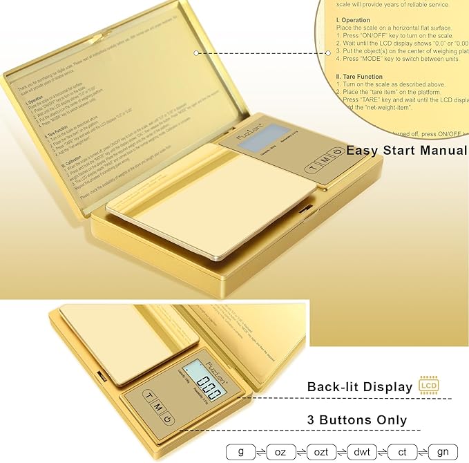 - Luxurious and Durable Design: This digital pocket scale features a stainless steel weighing platform with a luxurious gold titanium plating and a mirror finish, combining exceptional durability with a sleek, stylish look that stands out.