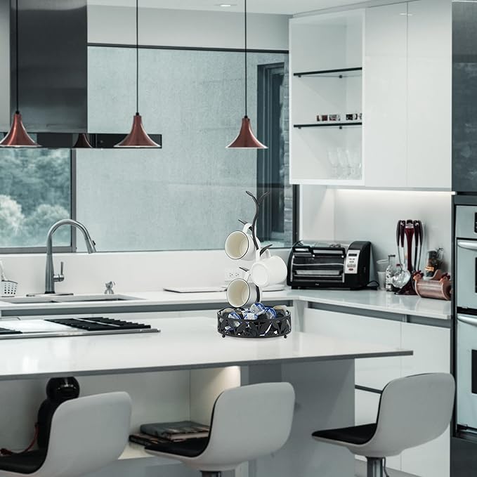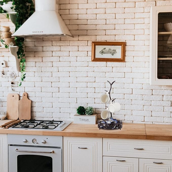 - Organize Your Countertops: This mug tree holds up to 4 coffee or tea mugs for easy access, organize your kitchen cups, and saving space on the countertop and in pantries or cabinets. Store mugs vertically on this tree to save counter and cabinet space. Let your kitchen countertops become organized, so that your cups are always within reach.