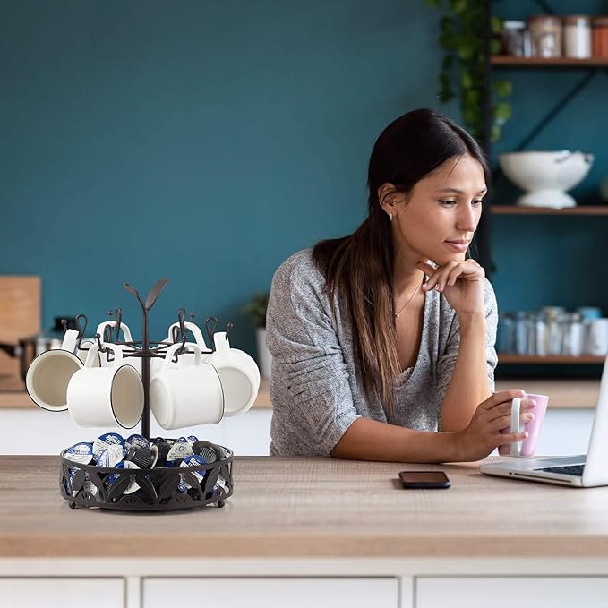 - Appropriate for Various of Space - The simple classical design of this black cup pods and mugs organizer can match many kinds of interior decoration style. The Rotatable coffee mug holder will not takes up too much space so that it will fit for the limited space beside the coffee maker in the kitchen or other space.