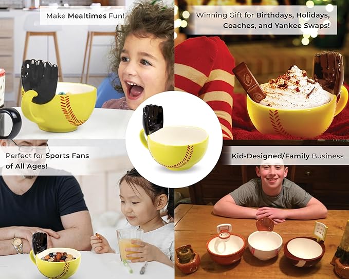 - Big Funny Coffee Mug – Interactive ceramic softball cereal/soup/rice bowl with a glove. Fun for tossing marshmallows into hot chocolate, cereal into milk or your favorite snacks.