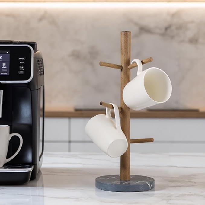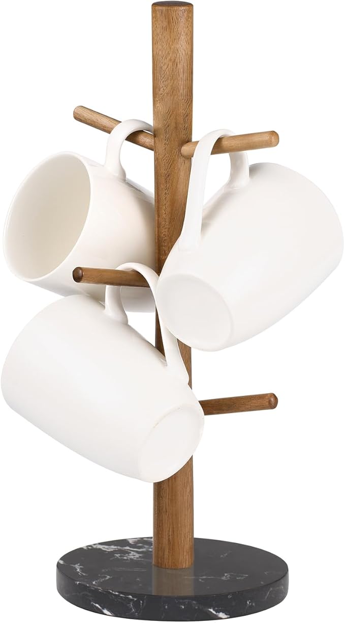 Buruis Mug Holder, Acacia Wood & Marble Base, 6 Hooks Kitchen Countertop Coffee Tea Cups Organizer