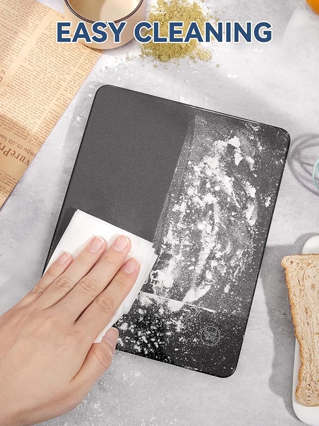 - Premium Material: Surface of the scale is food grade 304 stainless steel, safe and durable by multi-layer crafted, for you to weigh at more ease.The button and display is bright and clear with the tempered glass, anti-fingerprint, not easy to be scratched. The stainless surface won't be damaged by leaking liquid and easy to clean, just wipe to lean with a dry towel or a damp cloth, the scale will be brand-new