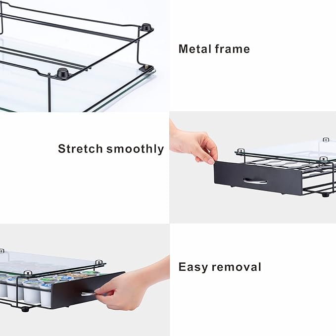 - STURDY METAL CONSTRUCTION - Made of heavy-duty metal to ensure stability to keep coffee maker from shifting and sliding. Solidly-built black powder-coated frame with the a termpered glass tabletop, four small non-slip fine felt bases to prevent scratching your table top. Easy-open sliding drawer with anti-derailed track and handle design, more convenient to pull and push.