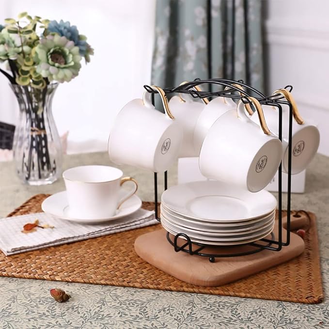 - Vertical Mug Tree for Counter: Mug holder with 6 hooks, to organizer coffee mugs and small saucer, even to set cups, mug lids, accommodating any size of ceramic or glass coffee or teacup. The coffee mug rack open design adds breezy flair to your kitchen decor. This coffee cup holder is made of strong metal and has an elegant gold coating. The round design makes your table simple and stylish, adding elegance to any kitchen