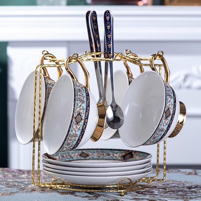 - Vertical Mug Tree for Counter: Mug holder with 6 hooks, to organizer coffee mugs and small saucer, even to set cups, mug lids, accommodating any size of ceramic or glass coffee or teacup. The coffee mug rack open design adds breezy flair to your kitchen decor. This coffee cup holder is made of strong metal and has an elegant gold coating. The round design makes your table simple and stylish, adding elegance to any kitchen
