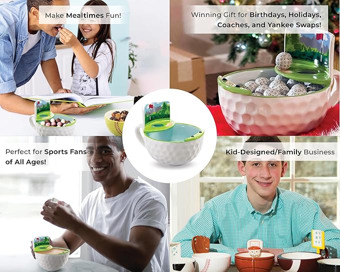 - Funny Gifts for Golfers – Interactive ceramic golf cereal/soup/rice bowl or coffee mug, with a green. Fun for tossing sugar cubes into latte or your favorite snacks.