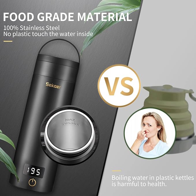 - Portable & Lightweight - The portable travel water bottle is only 8.8 inches and net weight 0.98 pounds, the compact design take it with you when you travel, camping or in the office. Especially suitable for use in a hotel without a clean electric kettle.