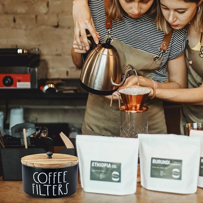 - Rustic Farmhouse Style - The perfect way to hide unsightly coffee filters without taking up space anymore, complements any countertop decor, matches your coffee bar. Classic black color and white letter "filters" match for a rustic vintage style for your coffee filter. This coffee filter container are made by hand, which means each piece will be unique.