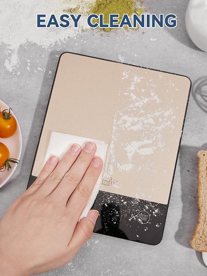- Premium Material: Surface of the scale is food grade 304 stainless steel, safe and durable by multi-layer crafted, for you to weigh at more ease.The button and display is bright and clear with the tempered glass, anti-fingerprint, not easy to be scratched. The stainless surface won't be damaged by leaking liquid and easy to clean, just wipe to lean with a dry towel or a damp cloth, the scale will be brand-new