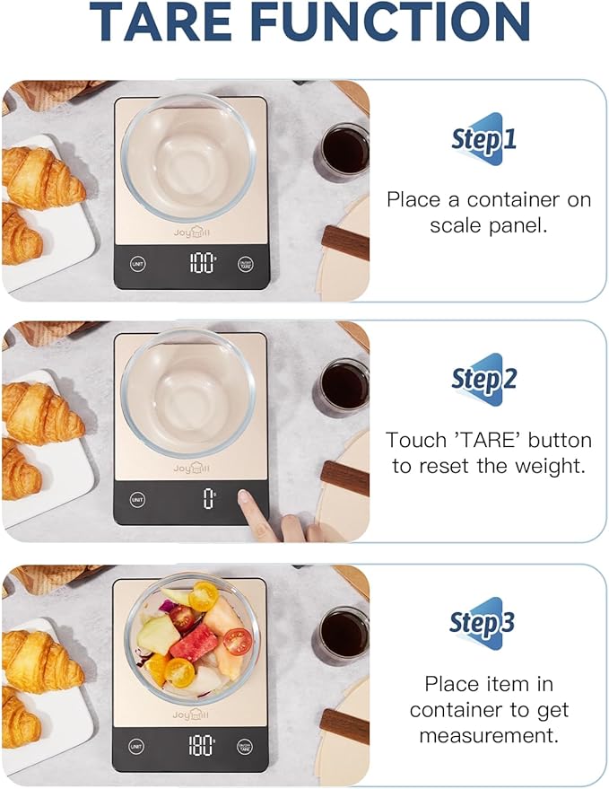 - Tare Function: Just press tare button, you will get the net weight of solid or liquid items by subtracting the weight of containers