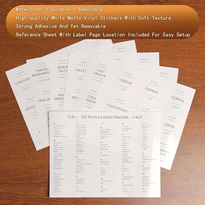 - 【PERFECT FOR PANTRY】132 Kitchen glass sugar container to keep your food fresh and pantry tidy. Minimalist labels are black text on white food labels stickers suitable for all airtight sugar container with lid. Pantry decal organization labels are preprinted on premium waterproof vinyl stickers that won't tear or peel off but can easily be removed.