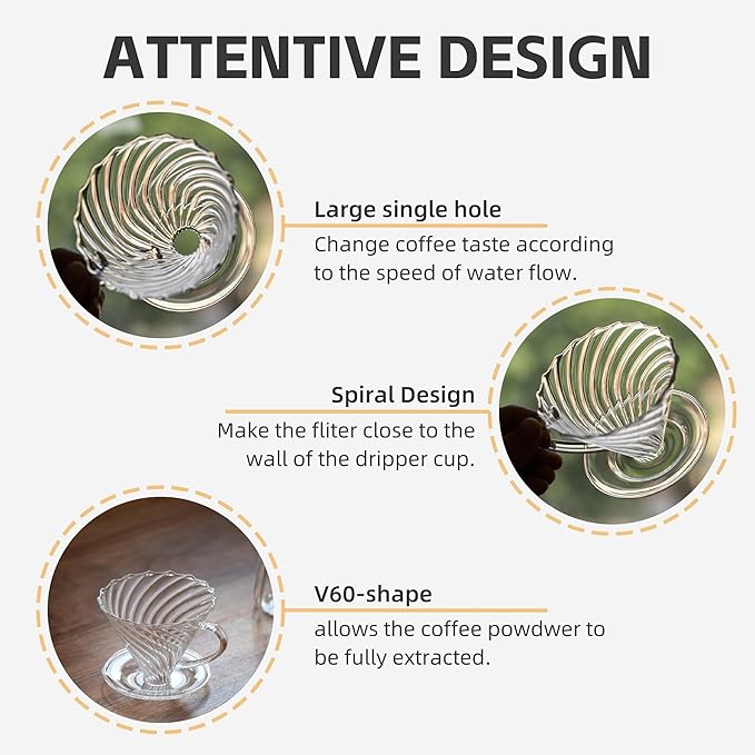 - High Quality Materials: The coffee dripper is made of borosilicate glass which is food-grade glass, premium clear, durable and reliable. High tempture and cold resistance.