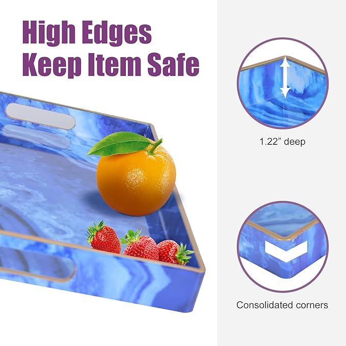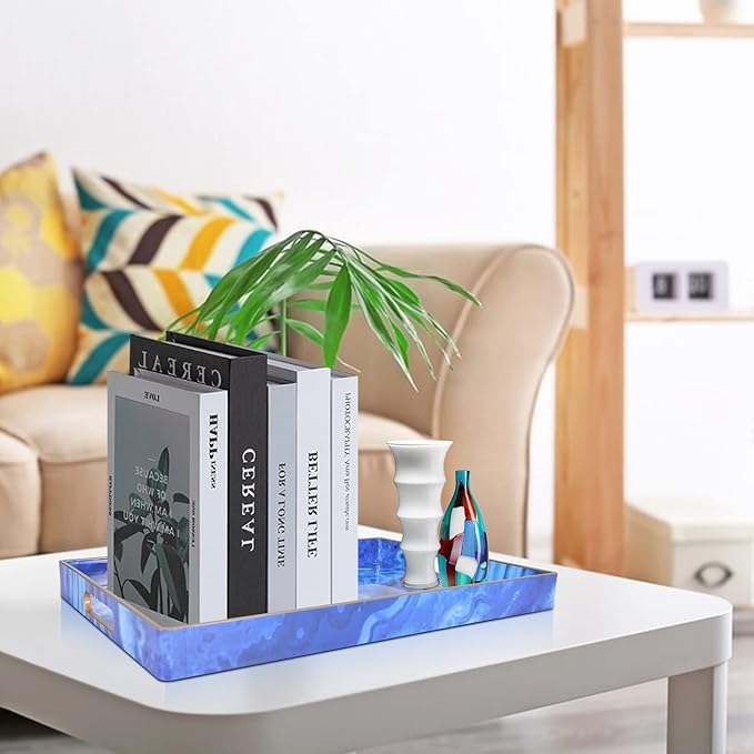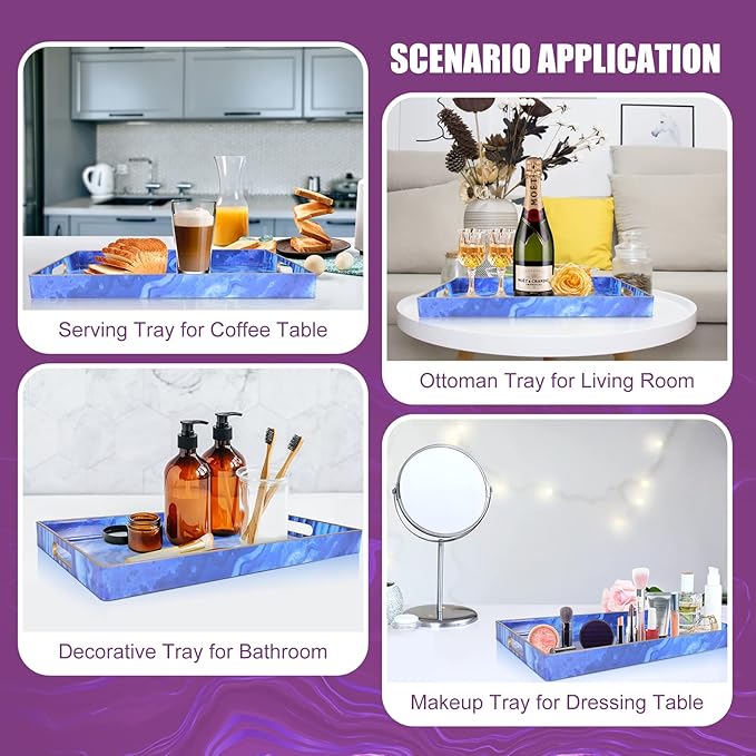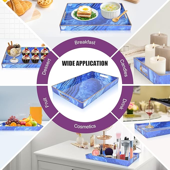 - 【Multipurpose Serving Trays】Designed for display and storage, this blue serving tray can be used as a decorative tray, makeup tray, jewelry tray, service tray and desktop organization tray.This serving tray can also be used as a storage box for small items such as keys or TV remote controls. Also perfect for serving snacks, breakfast lunch or dinner.