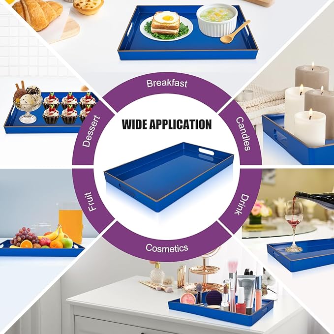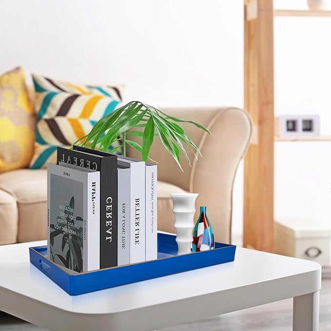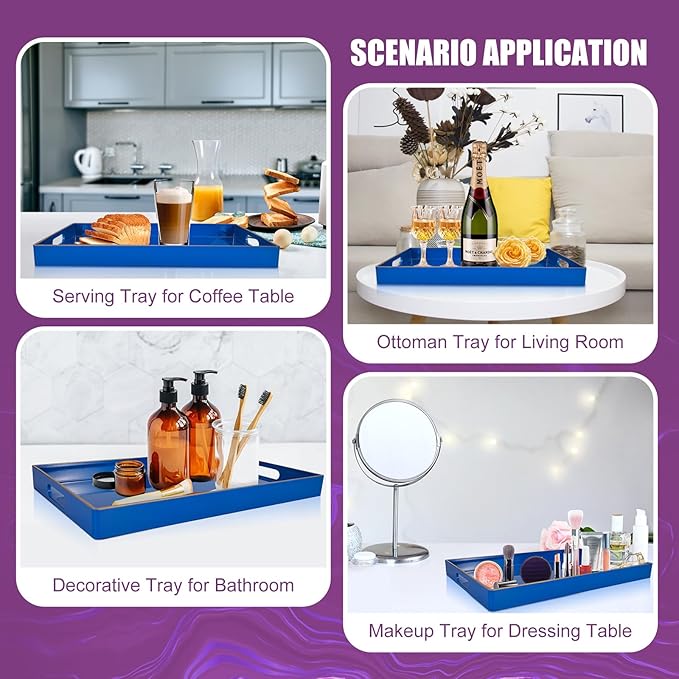 - 【Multipurpose Serving Trays】Designed for display and storage, this blue serving tray can be used as a decorative tray, makeup tray, jewelry tray, service tray and desktop organization tray.This serving tray can also be used as a storage box for small items such as keys or TV remote controls. Also perfect for serving snacks, breakfast lunch or dinner.