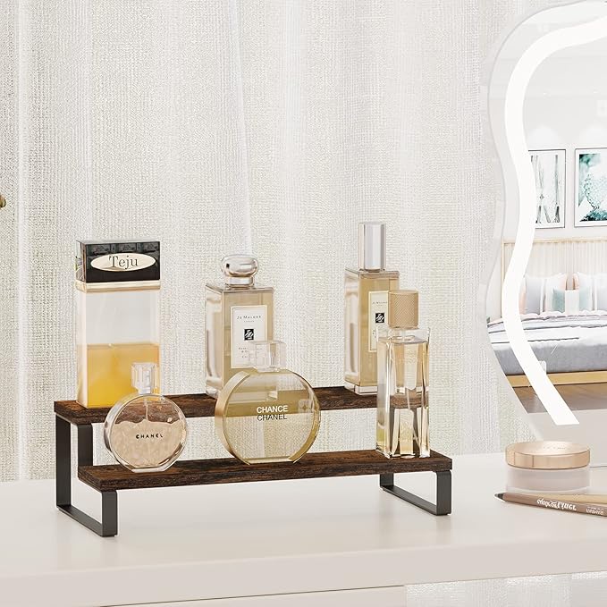 YINMIT Wooden Display Riser Stand, Tiered Perfume and Cologne Organizer Stand, 2 Tier Spice Rack Organizer, Rustic Display Shelf for Candles (2 Tier)