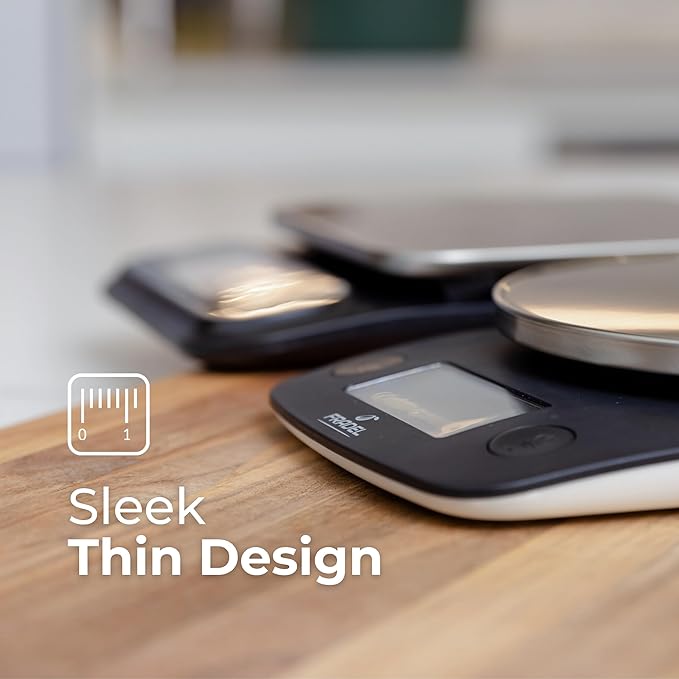 - Premium & Elegant: Sleek, thin profile makes this small portable food scale easy to store and travel with. Stainless steel plate and protective seal make it waterproof, smudge-proof, & easy to clean.