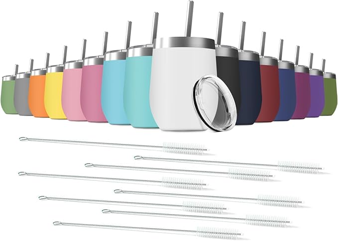 12oz Wine Tumbler with Lid With straw Stainless Steel Wine Tumbler Cups Double Wall Vacuum Insulated Travel Mugs Stemless Cup 16 Pack