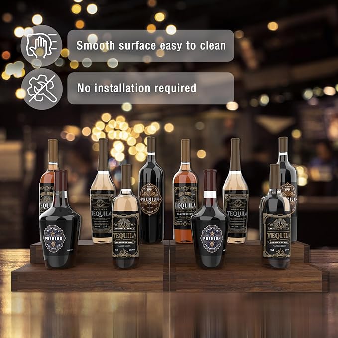 - SUITABLE FOR MULTIPLE OCCASIONS: This solid wood liquor shelf features a unique two-tier design that can meet all your wine collection display needs. Its large capacity allows you to easily and quickly find the wine you need. Additionally, this two-tier display rack is also ideal for showcasing your perfume, cologne, collectibles, baked goods, and any other items you want to display.