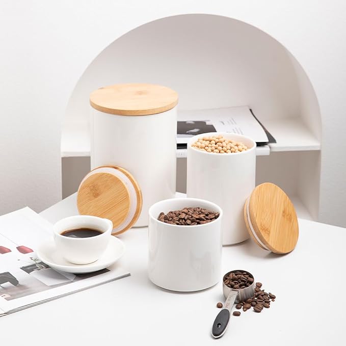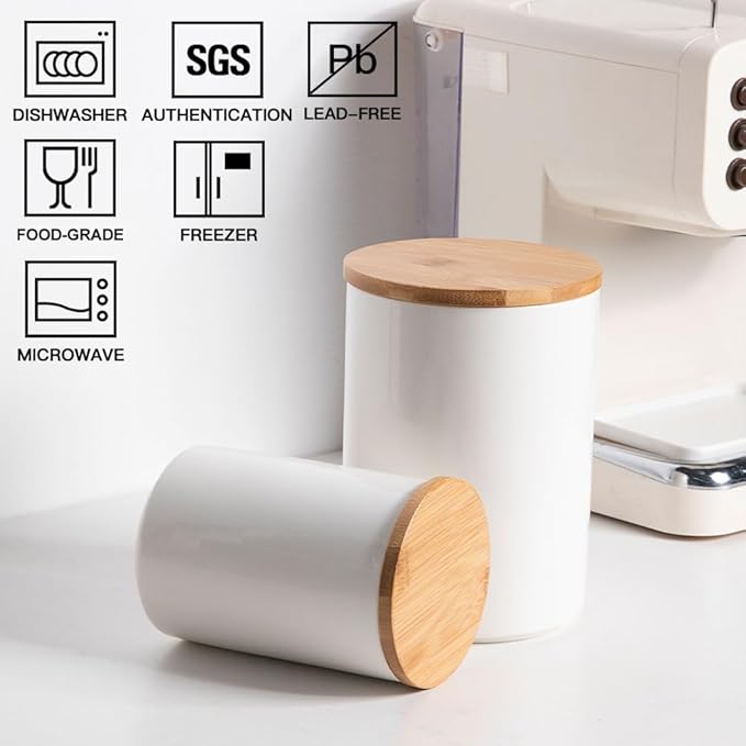 Sweejar Kitchen Ceramic Food Storage Containers Set, Stackable Canisters for Countertop with Airtight Boomboo Lids for Serving Ground Coffee, Tea, Sugar, Salt and More- Set of 2 (White)