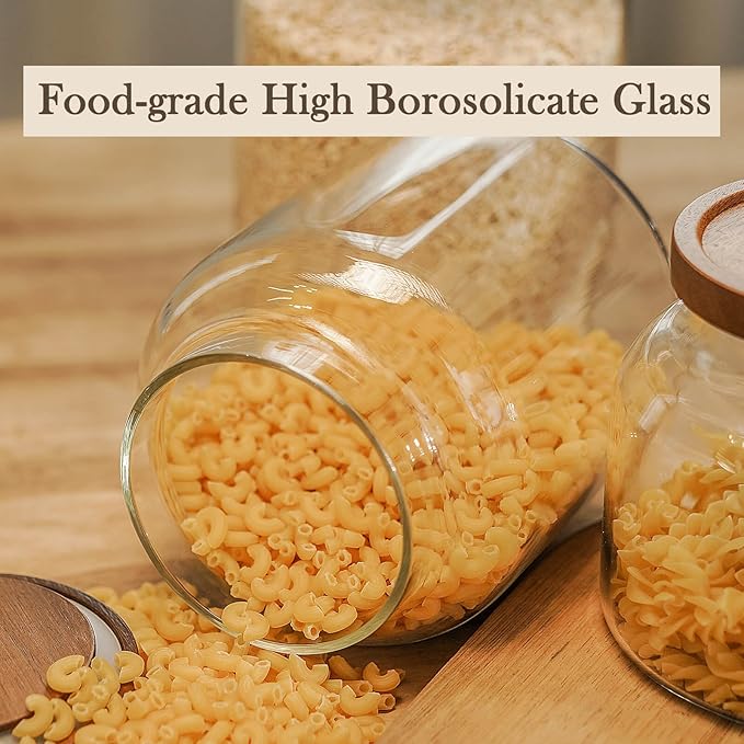 - AIRTIGHT LIDS - The glass kitchen canisters are with an airtight wooden lid, it can seal the content away from humidity and air. Keeps food fresh longer. Glass and wood lidded canister makes a perfect storage and display solution for your home.