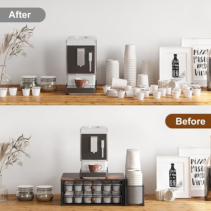 - Adjustable Drawer Dividers: Unlike regular fixed-width coffee drawers, our style is designed to be adjustable. This means that you can not only store regular-sized coffee pods, but also adjust the drawer based on your actual storage needs to accommodate different-sized pods, you can even remove the dividers and turn it into a larger single space pod drawer to store tea bags, sugar packets, instant coffee packets, and other coffee items. It is multi-functional and practical