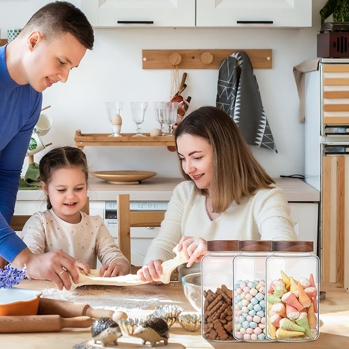 - 【WIDE APPLICATIONS】 Glass kitchen canisters for pantry organization and storage are suitable for storing various dried ingredients to retain their freshness, with clear glass jars, you can easily see inside and quickly find the ingredients you need.Glass jars with wood lids perfect for storing dry food , such as,cookies,dried beans,pepper,oatmeal,jams,chutneys, rice, flour, tea, coffee, biscuits, candy,cheese,flour, sugar, seeds,etc. Keep your kitchen tidy and safe,saving space and convenient .