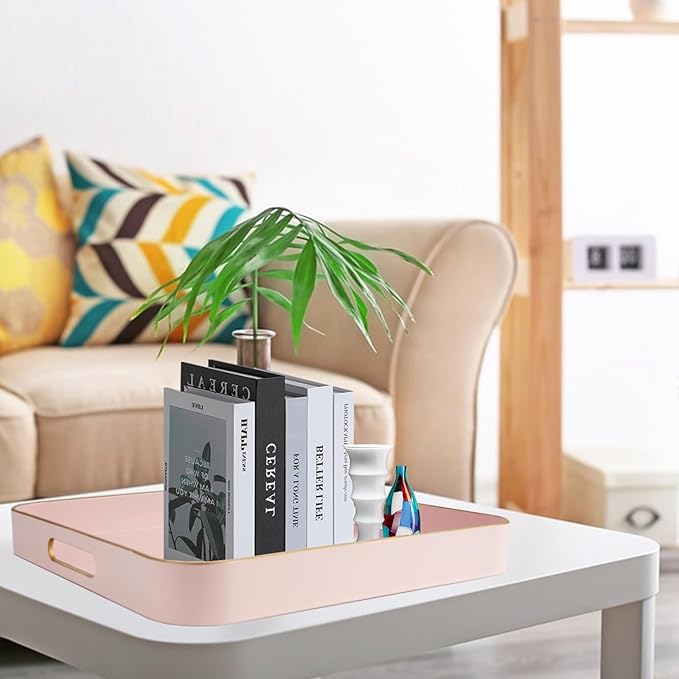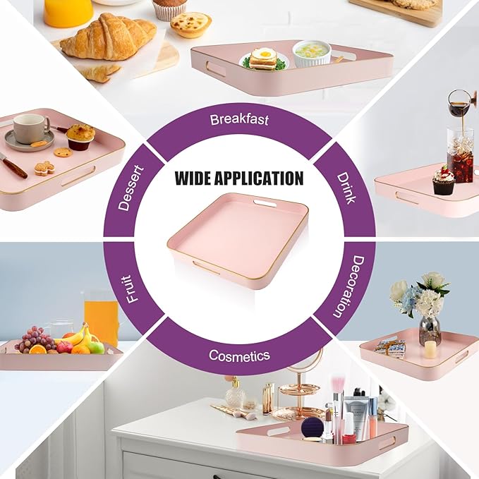- 【Multipurpose Serving Trays】Designed for display and storage, this pink square serving tray can be used as a decorative tray, makeup tray, jewelry tray, service tray and desktop organization tray.This serving tray can also be used as a storage box for small items such as keys or TV remote controls. Also perfect for serving snacks, breakfast lunch or dinner.