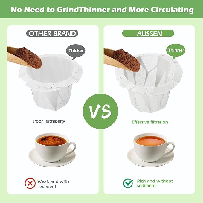 - 【Nice Thickness】: The filter paper neither too thin to be split up or leak, nor too thick to make the coffee weak. Thinner but better flow through.Fits Into Most K-cups Paper Filters,Easily Flow Through With Good Test No Grounds: good quality disposable coffee filters help you to make a nice cup of coffee with good taste. Filter paper can filter most of coffee grounds and make the taste more silky and crema rich