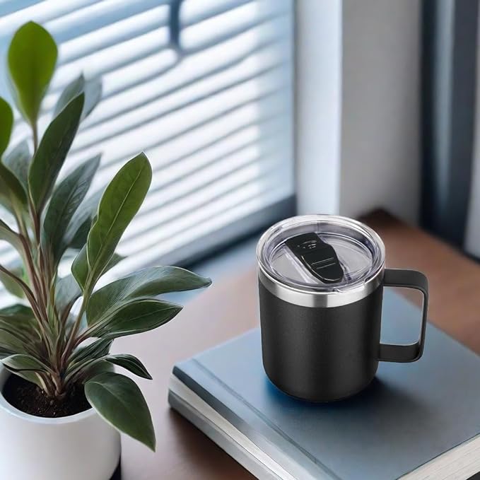 Volhoply 14oz Insulated Stainless Steel Coffee Mug with Lid Bulk 4 Pack,Double Wall Vacuum Travel Coffee Cup with Handle,Reusable Metal Cups Tumbler,Camping Mugs Keep Hot,Ideal Gifts(Black,4)