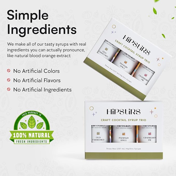 - The HipStirs Promise - We want your first experience with our holiday trio pack to be perfect. If for any reason something is wrong with one of your cocktail syrup flavors let us know and we'll send you a new one