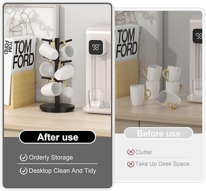 - 【360°Rotating Humanized Design】Our black mug stand has a 360° rotation function, just gently rotate the coffee cup holder to get the cup anywhere, even in a corner. More flexible and saves time