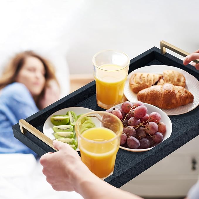 Black Faux Leather Serving Tray, 17x12 inches, Brushed Gold Handles, Decorative Tray for Ottoman Coffee Table, Living Room, Kitchen, Bathroom