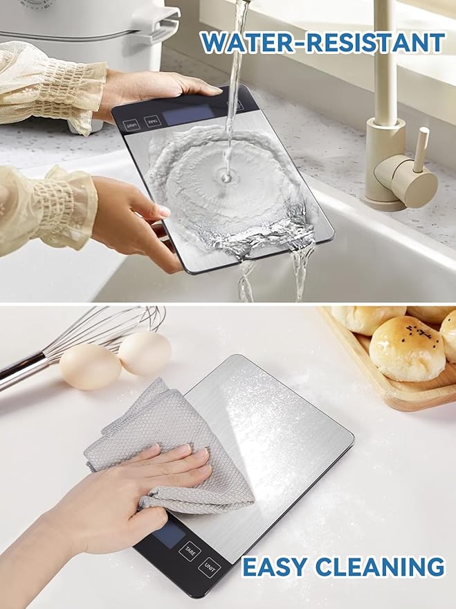 - PREMIUM MATERIAL: Surface of the scale is food grade 18/8 stainless steel, safe and durable by multi-layer crafted, for you to weigh at more ease. The button and display is bright and clear with the tempered glass, anti-fingerprint, not easy to be scratched. The stainless surface won't be damaged by leaking liquid and easy to clean, just wipe to clean with a dry towel or a damp cloth, the scale will be brand-new