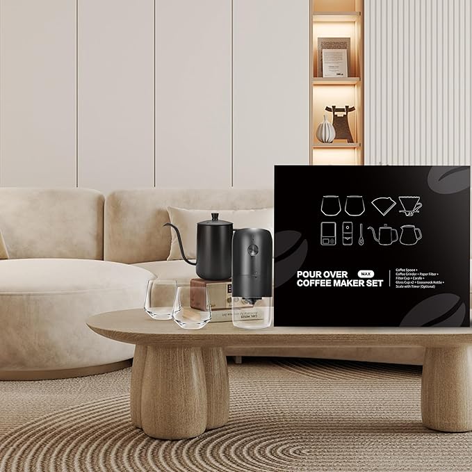 - π ALL-IN-1 SET: This set comes with 1pc 32oz gooseneck kettle, 1pc glass dripper, 1pc 20oz glass coffee server, 50pcs paper coffee filters, 2pcs 10oz glass coffee cups, 1 pcs coffee spoon, 1pc electric coffee grinder, 1pc coffee scale. This is a professional pour over coffee maker kit that is ideal for professionals.
